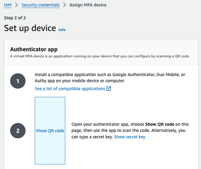 6. Tại màn hình set up device này, chọn vào show QR code, mở Authy lên và quét QR code