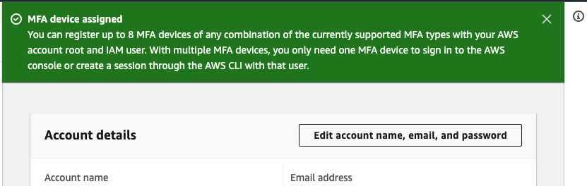 AWS sẽ thông báo đã bật MFA thành công như bên dưới